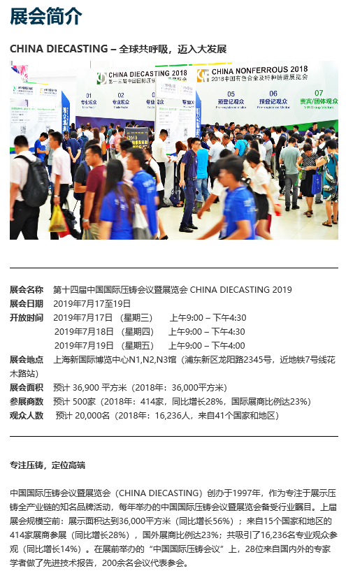 本公司將于2019年7月17-19日參展中國國際壓鑄展會,展位號為N2B42;